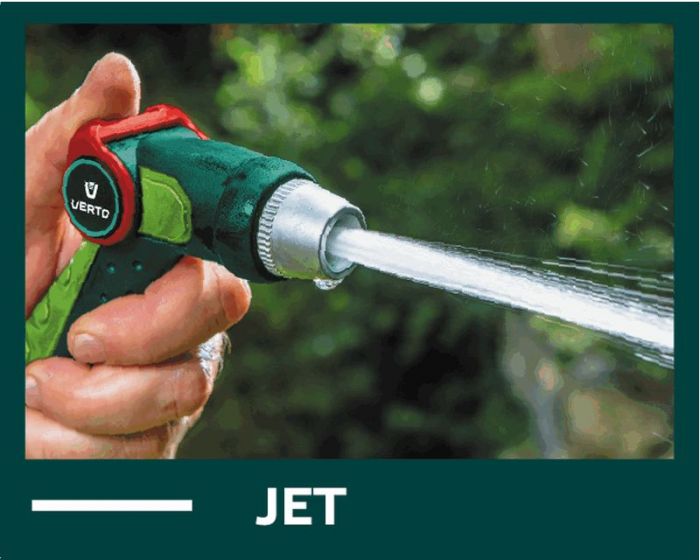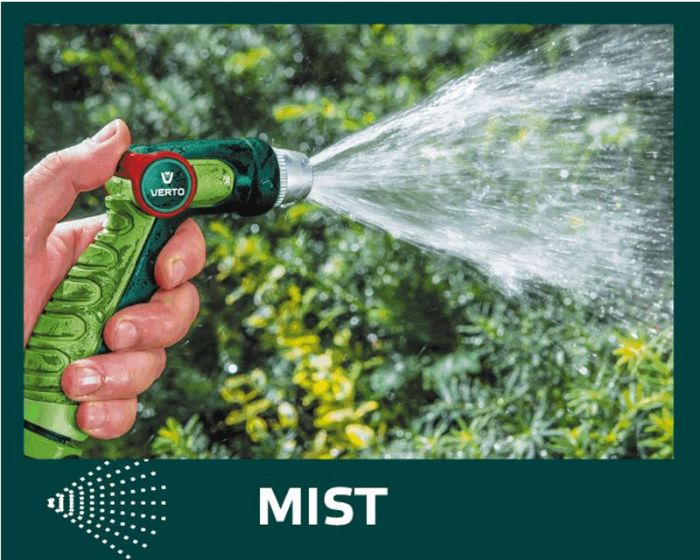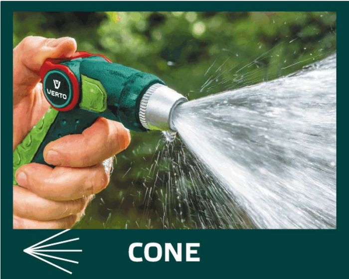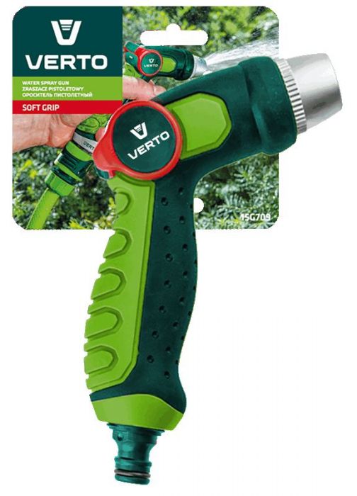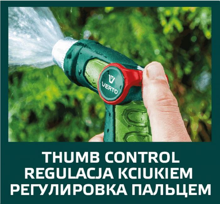Zraszacz pistoletowy VERTO (nr ref. 15G709) z płynna regulacją strumienia za pomocą kciuka. Regulowana głowica umożliwia ustawienie kształtu strumienia wody od mgiełki do silnego strumienia punktowego. Uchwyt o ergonomicznym kształcie dobrze leży w dłoni i nie wyślizguje się, co podnosi komfort pracy.